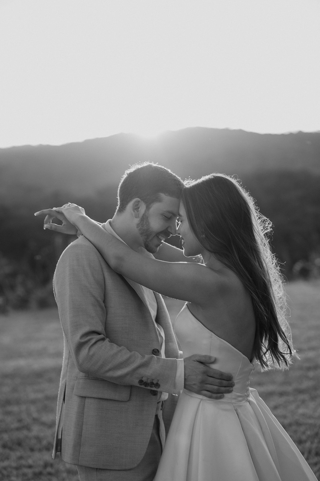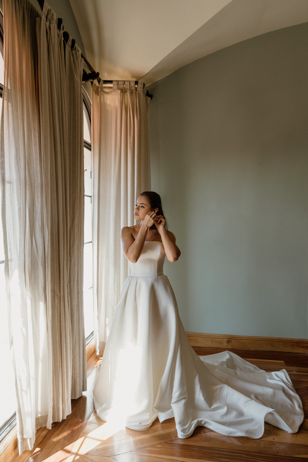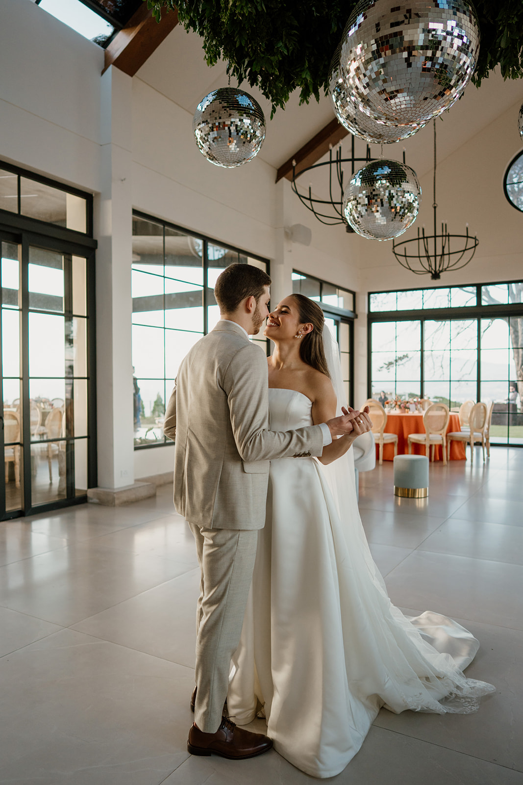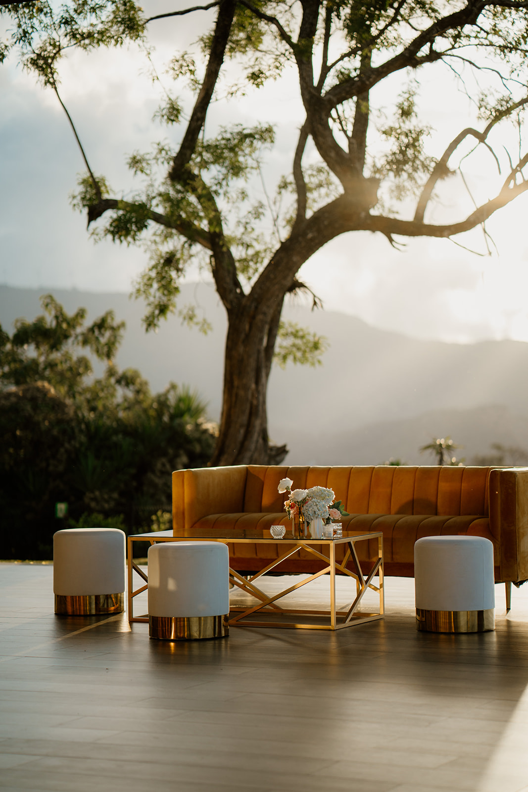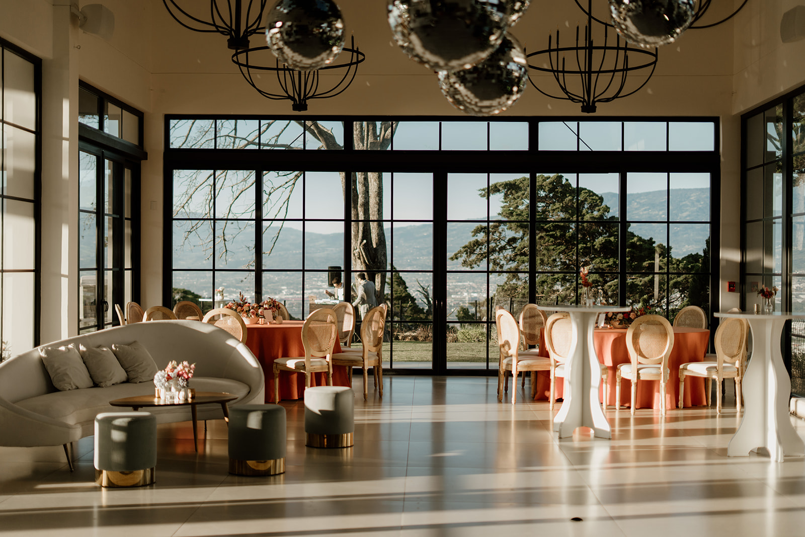 Andrea got ready at Hotel Alta Las Palomas, surrounded by soft morning light and views stretching over the hills. Their ceremony at Parroquia San Miguel Arcángel brought a classic, heartfelt energy to the day. At Alta Fiori, the reception space mixed natural textures with thoughtful design: stone finishes, neutral florals, and warm candlelight set the tone, while a cluster of disco balls above the dance floor brought a lively twist as night fell. With sweeping city views and a relaxed, modern vibe, it was the perfect setting to celebrate. The next day’s session in Ciudad Colón offered a quiet contrast: just the two of them, soft light, and time to breathe it all in.
