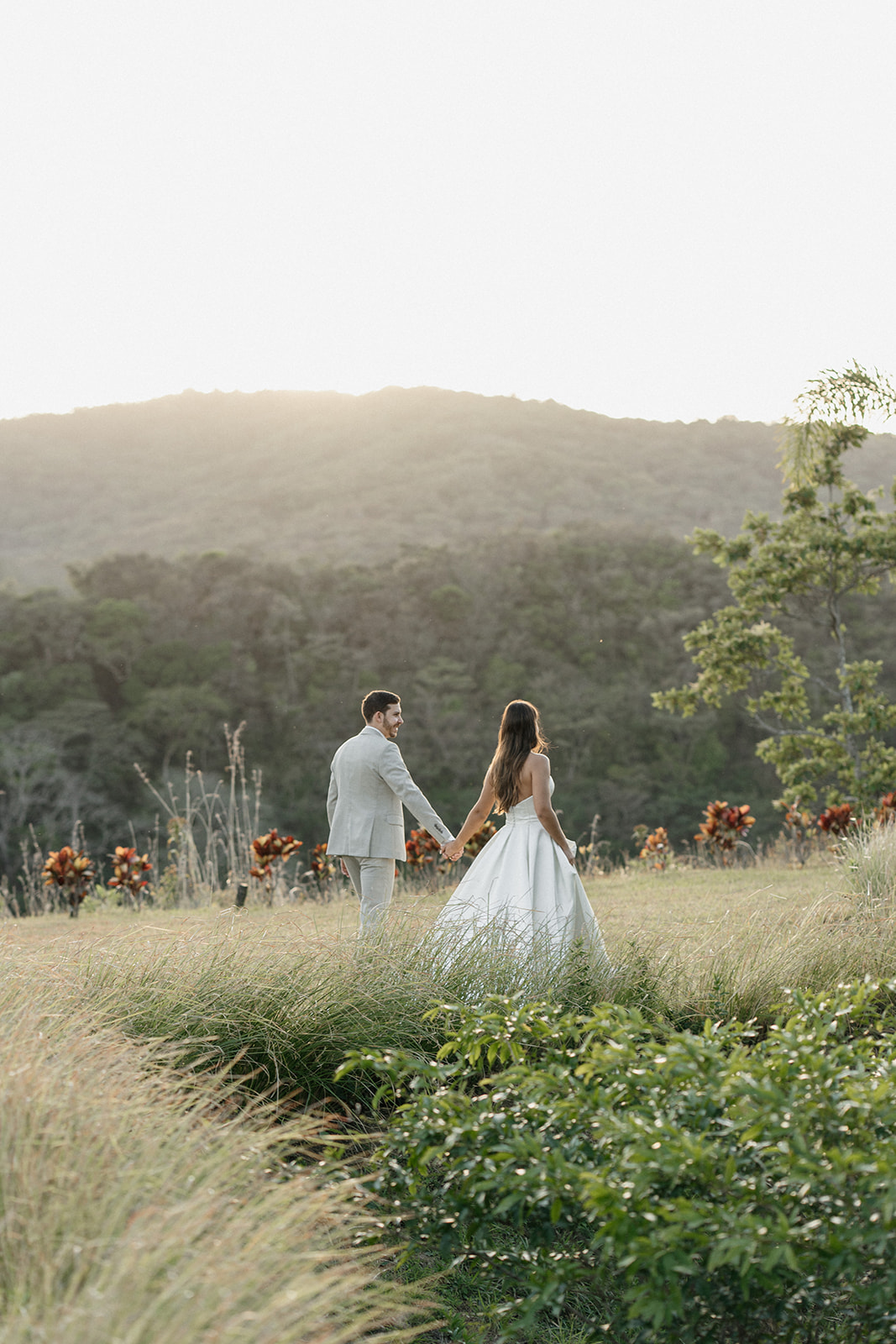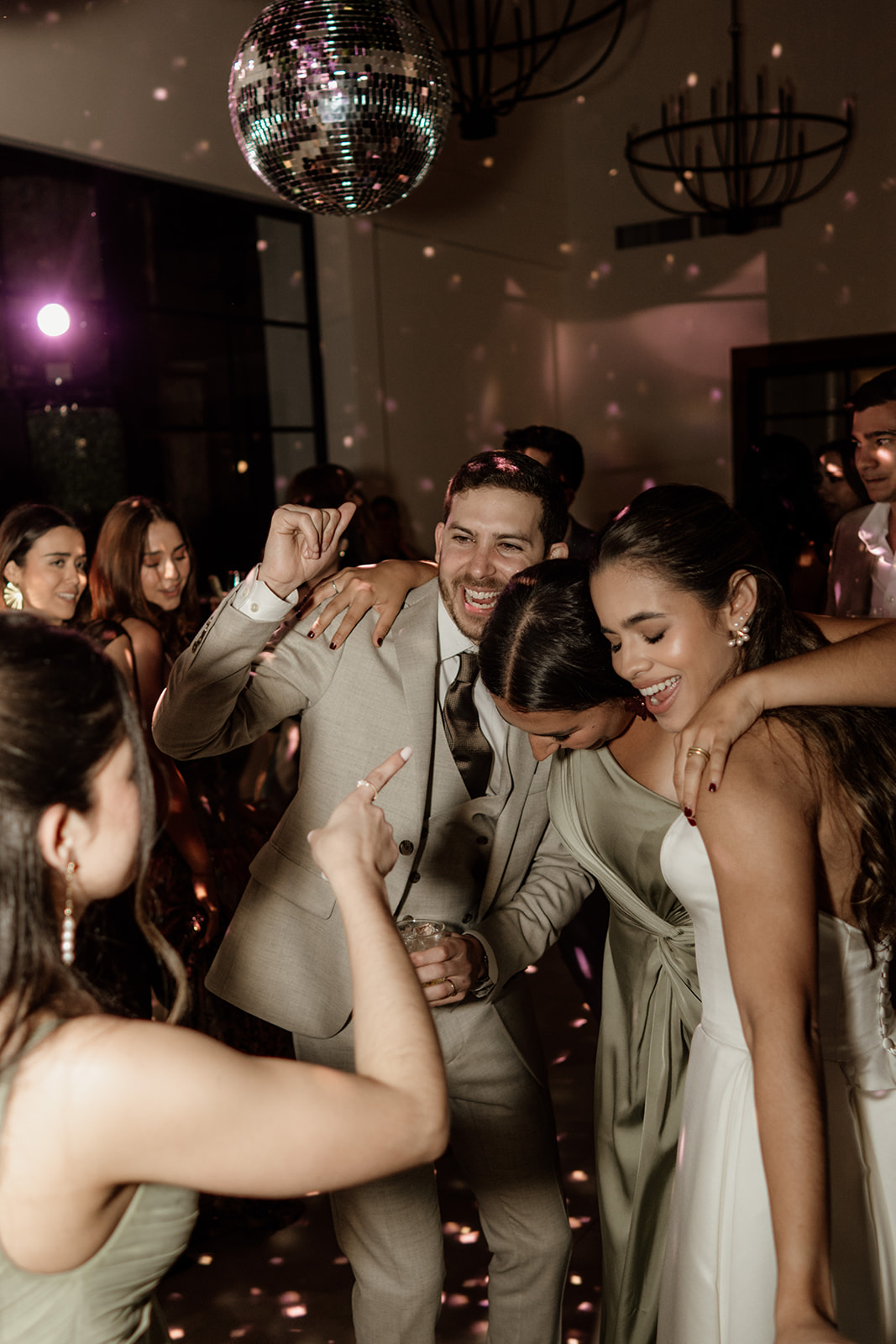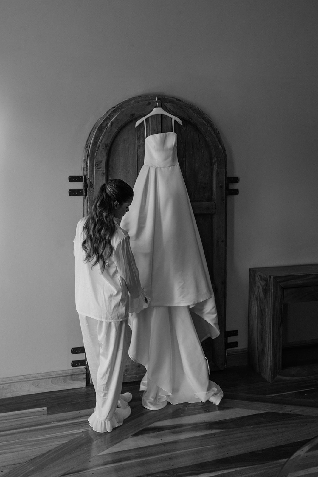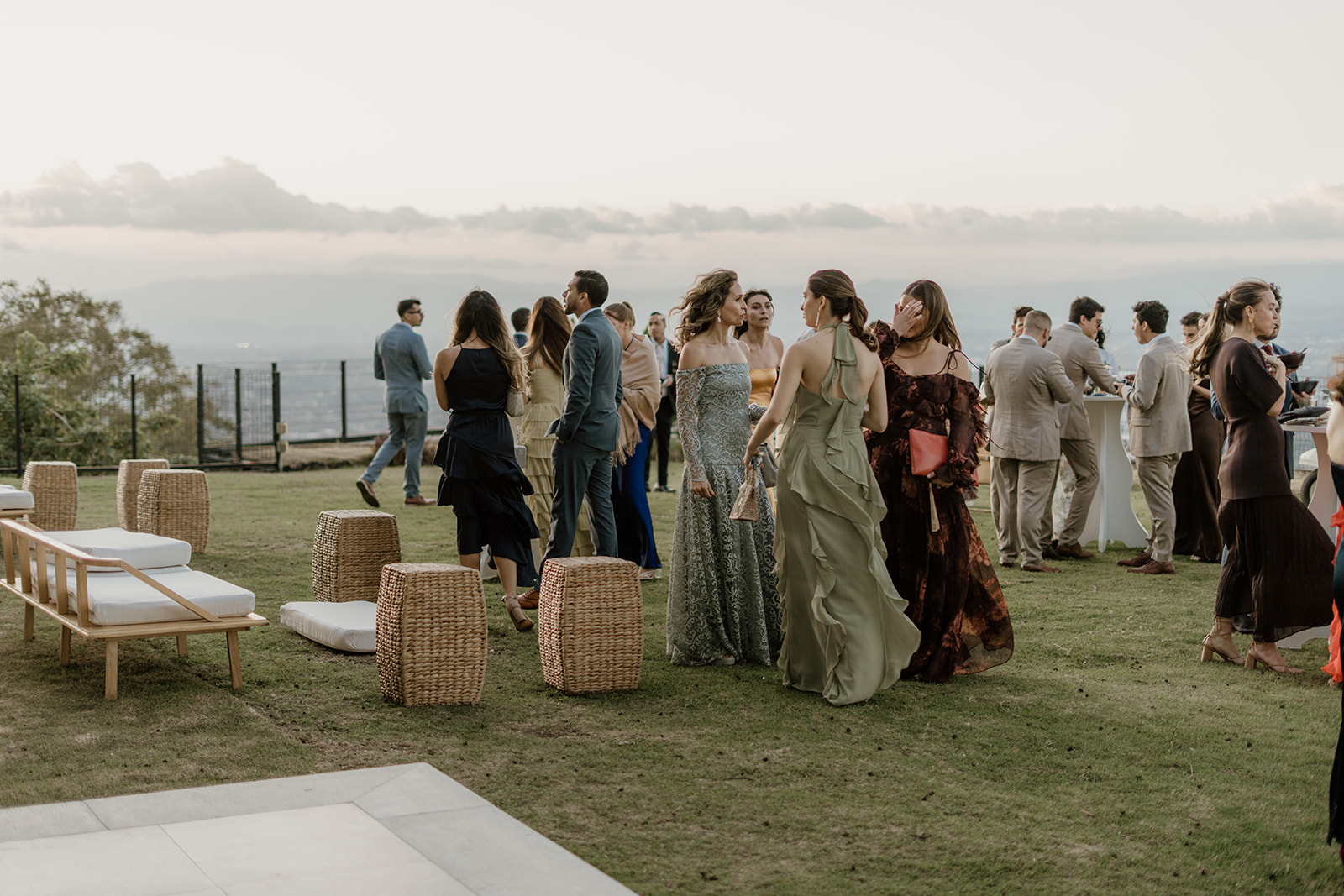 Andrea got ready at Hotel Alta Las Palomas, surrounded by soft morning light and views stretching over the hills. Their ceremony at Parroquia San Miguel Arcángel brought a classic, heartfelt energy to the day. At Alta Fiori, the reception space mixed natural textures with thoughtful design: stone finishes, neutral florals, and warm candlelight set the tone, while a cluster of disco balls above the dance floor brought a lively twist as night fell. With sweeping city views and a relaxed, modern vibe, it was the perfect setting to celebrate. The next day’s session in Ciudad Colón offered a quiet contrast: just the two of them, soft light, and time to breathe it all in.
