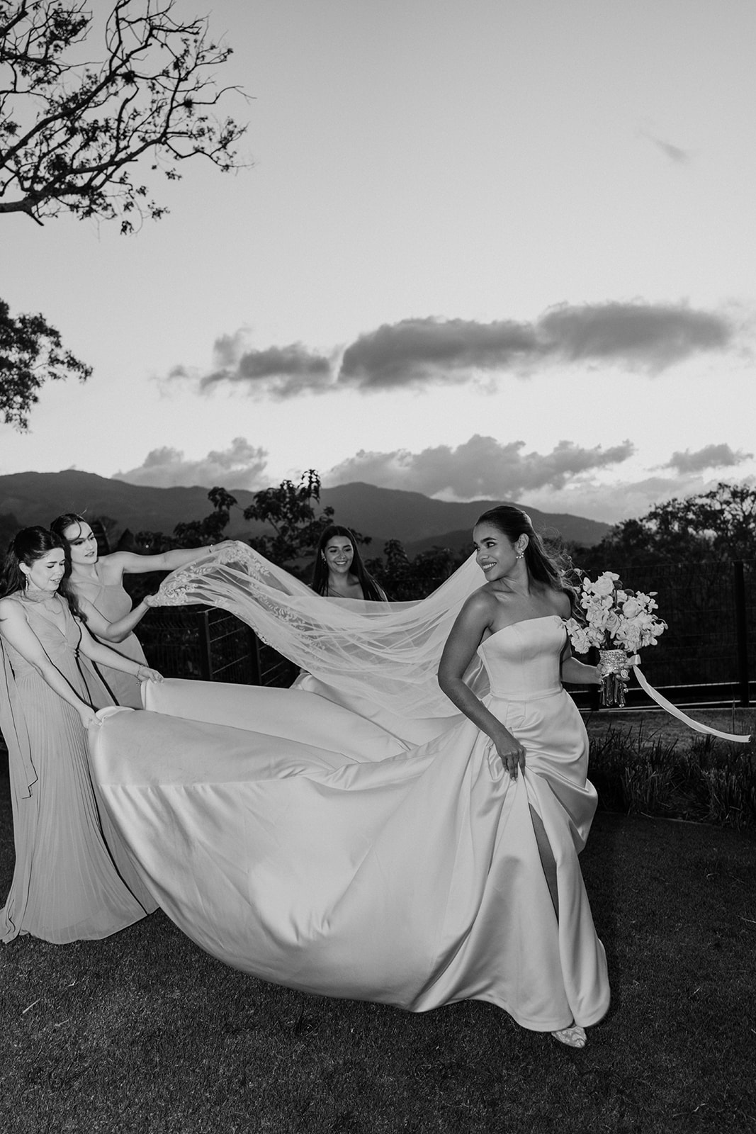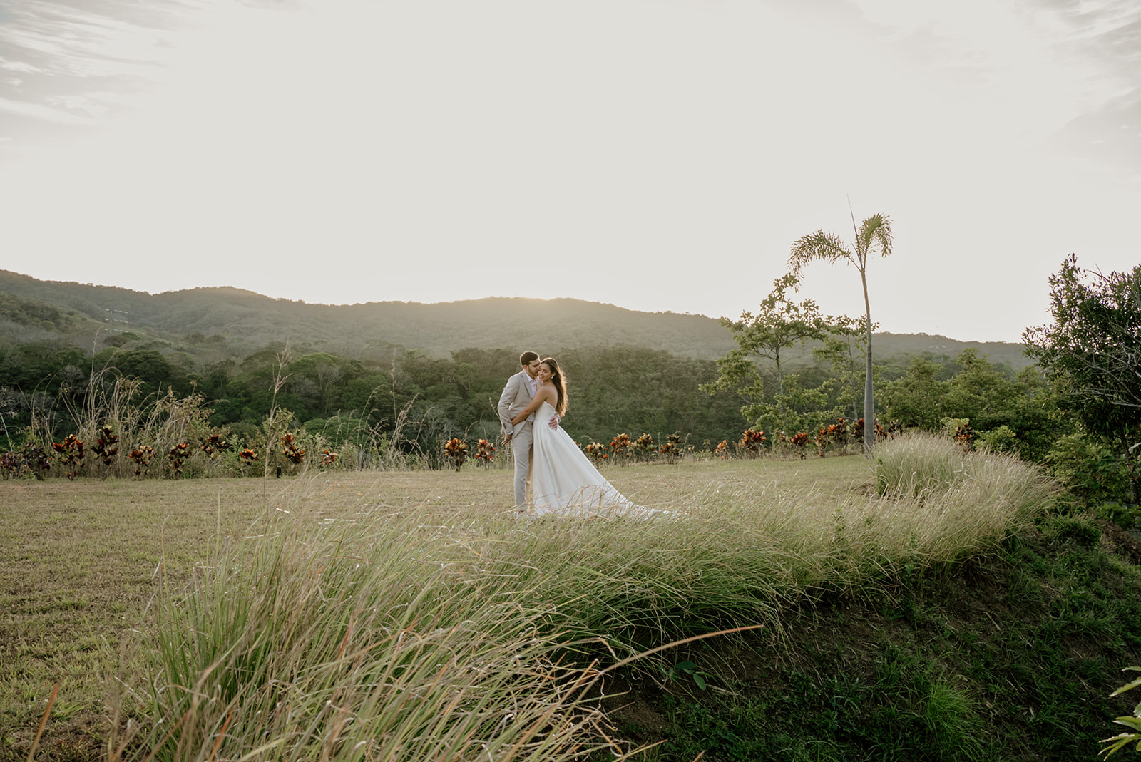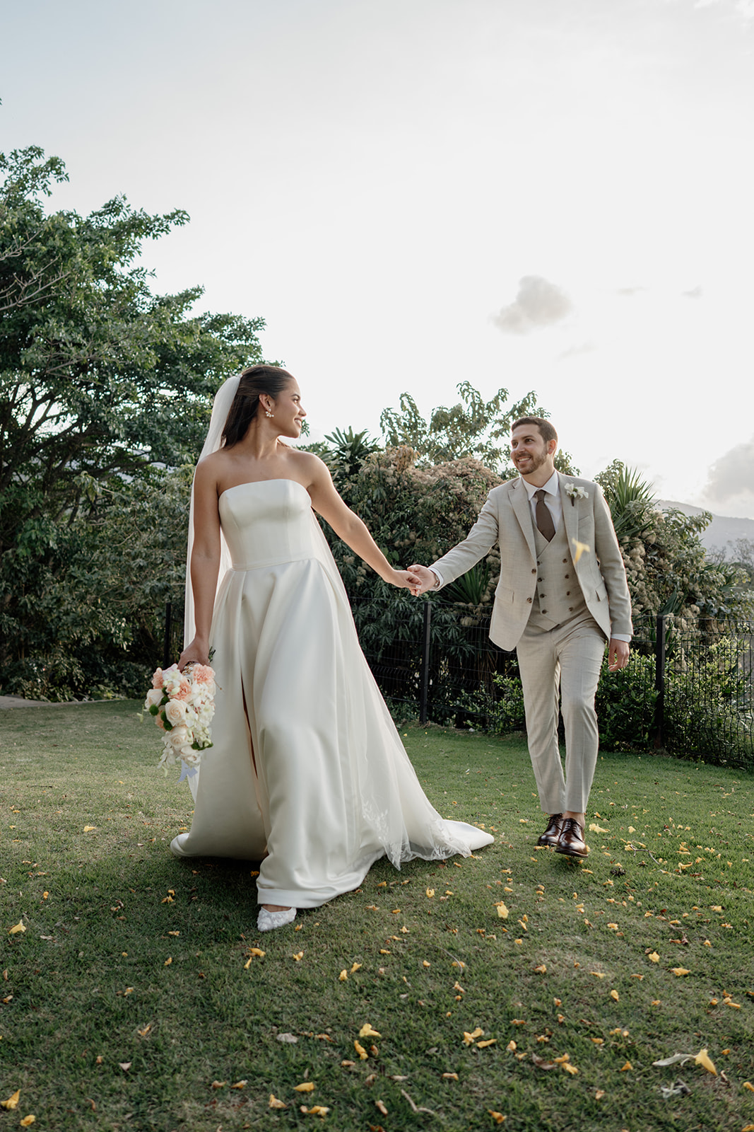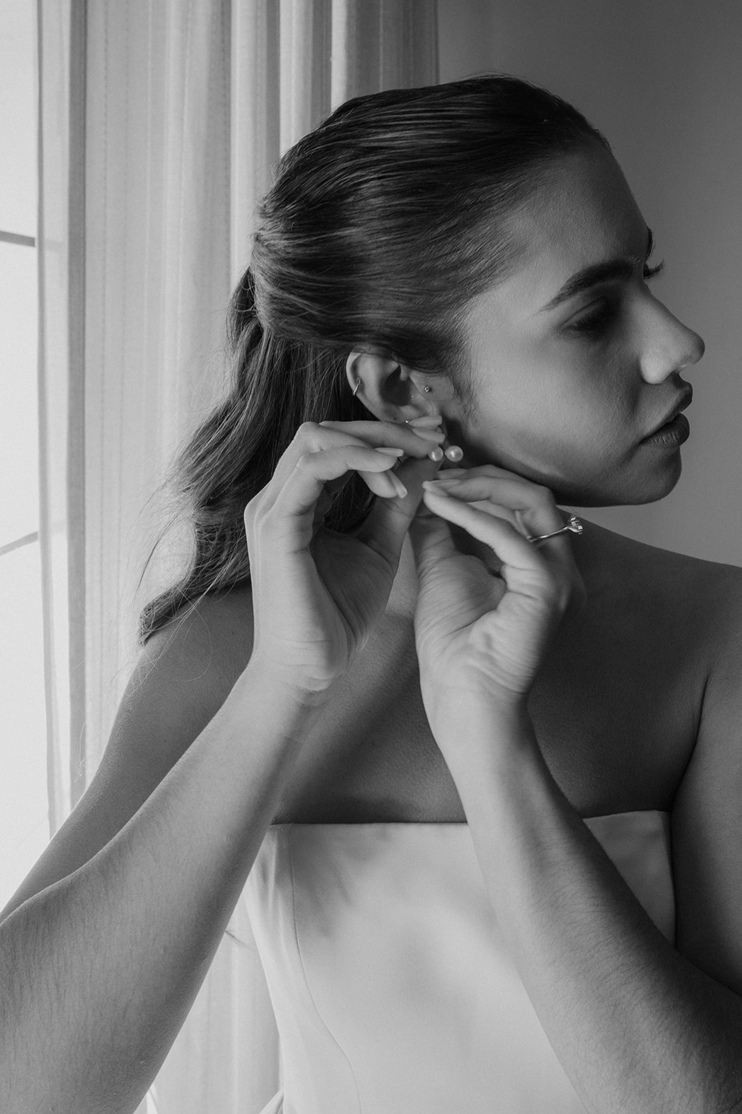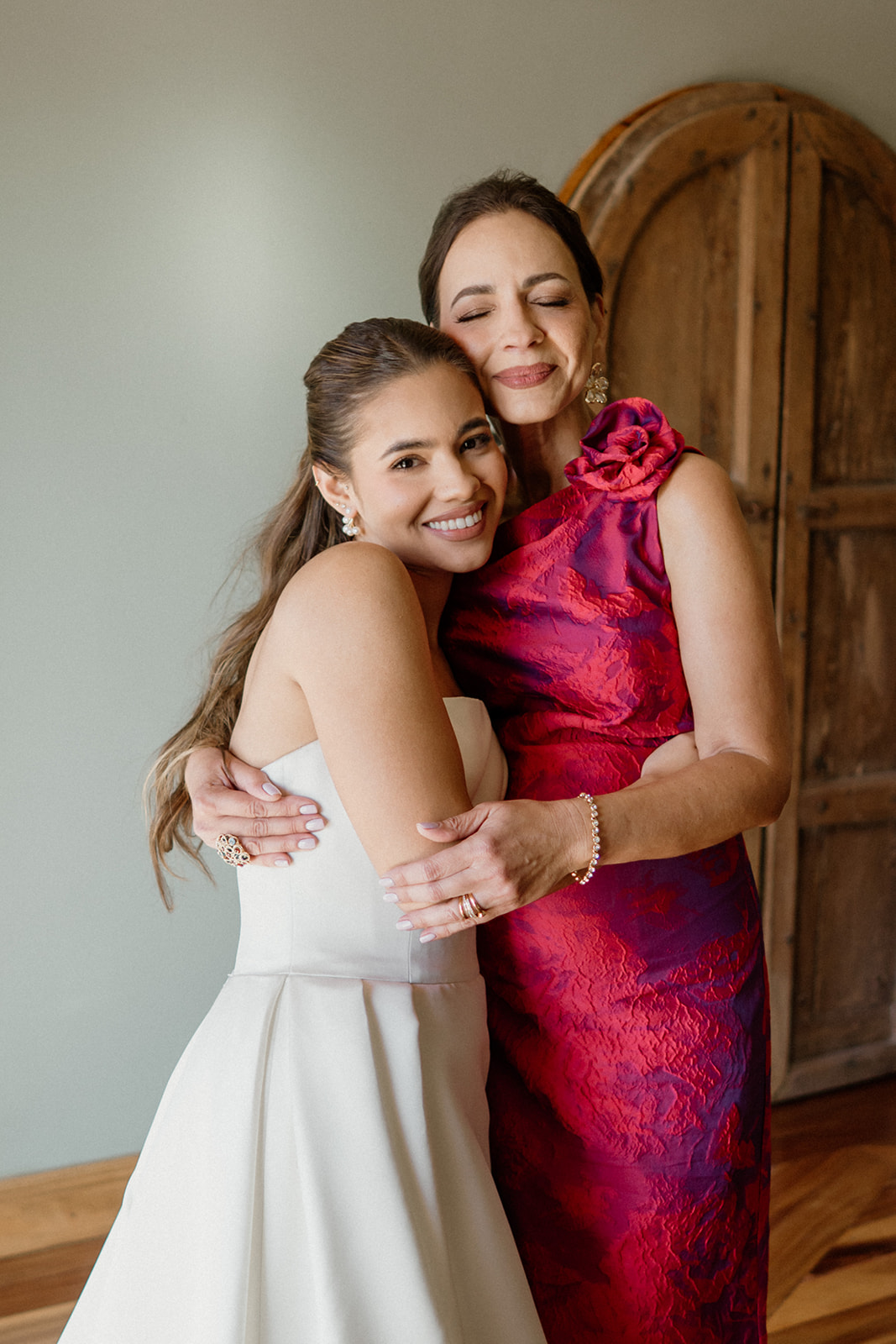 Andrea got ready at Hotel Alta Las Palomas, surrounded by soft morning light and views stretching over the hills. Their ceremony at Parroquia San Miguel Arcángel brought a classic, heartfelt energy to the day. At Alta Fiori, the reception space mixed natural textures with thoughtful design: stone finishes, neutral florals, and warm candlelight set the tone, while a cluster of disco balls above the dance floor brought a lively twist as night fell. With sweeping city views and a relaxed, modern vibe, it was the perfect setting to celebrate. The next day’s session in Ciudad Colón offered a quiet contrast: just the two of them, soft light, and time to breathe it all in.